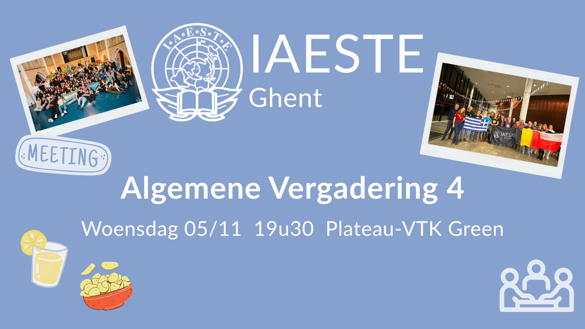 Allen aanschouw! De vierde algemene vergadering van IAESTE! Deze vindt plaats in studentenlokaal 0.7 IAESTE/BEST op 5 november om 19u30. Het thema deze week is Cozy Meeting, doe je zachtste trui aan en kom chocomelk meedrinken!