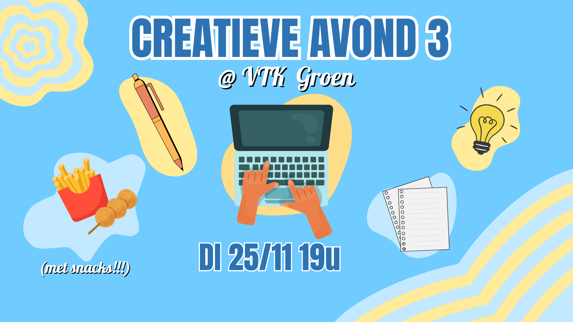 We hopen jullie allen te zien in VTK Groen om 19u. Omdat er op lege maag natuurlijk niet te werken valt voorzien we lekkere snacks!