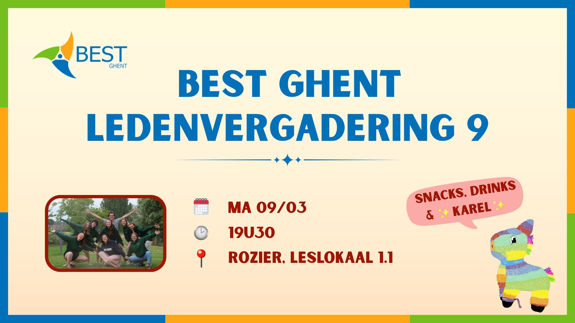 Dit is de 9de ledenvergadering van BEST, deze vindt plaats in leslokaal 1.1 in het Roziergebouw, om 19u30. Iedereen is zeker welkom, ook als je nog niets van BEST afweet! Mocht je met vragen zitten, contacteer ons dan zeker (ghent@best-eu.org).